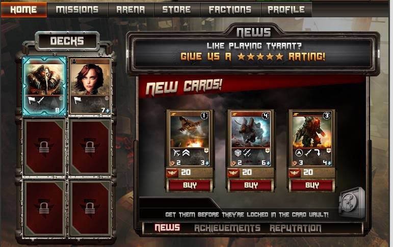 Tyrant é uma Magic Card online totalmente Gratuito,o jogo consiste numa série de batalhas contra oponentes do próprio jogo e com o avançar da campanha é possivel liberar cartas novas e até mesmo duelar contra outros oponentes reias.